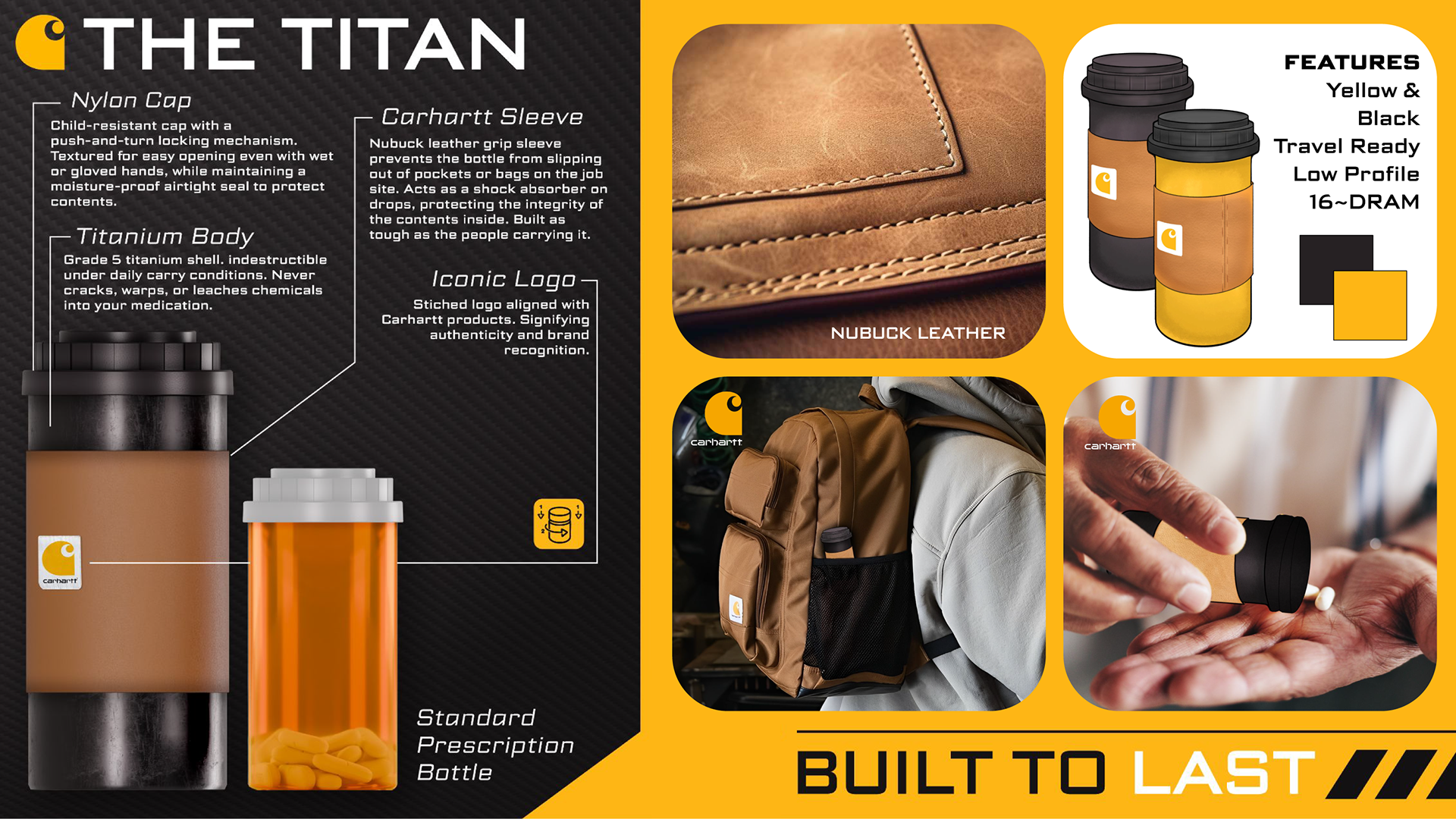 Redesigning the unsustainable and generic Polypropylene pill bottle for a sturdy, long-lasting titanium body that maintains the chemically resistant properties of the original polypropylene. We drew inspiration from Carhartt, a brand that supports an honest product at a reasonable price for a good, hardworking community. For the cap, we used Nylon to make sure you know that your essentials are kept safe with enhanced durability and stiffness. To create a comfortable user experience that further protects the bottle from blunt forces, prevents slippage, and aligns with our partner brand, we have given the bottle a Carhartt-classic nubuck leather sleeve.