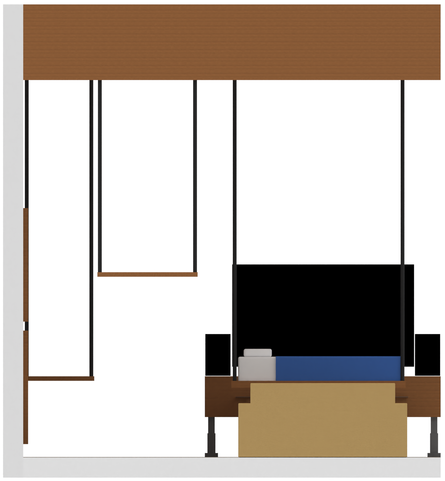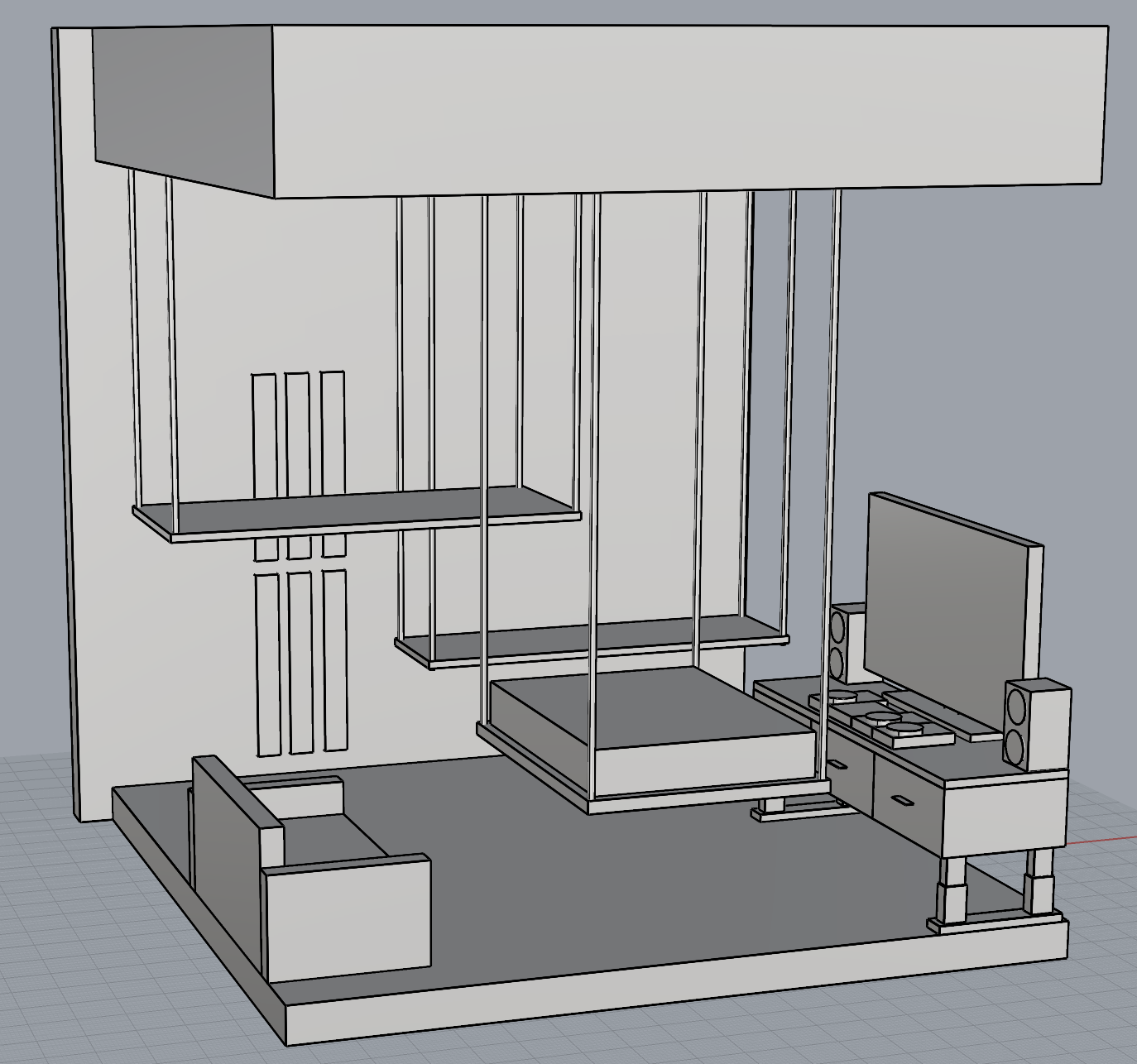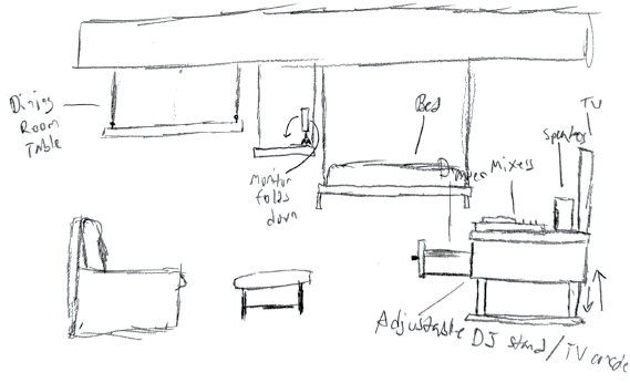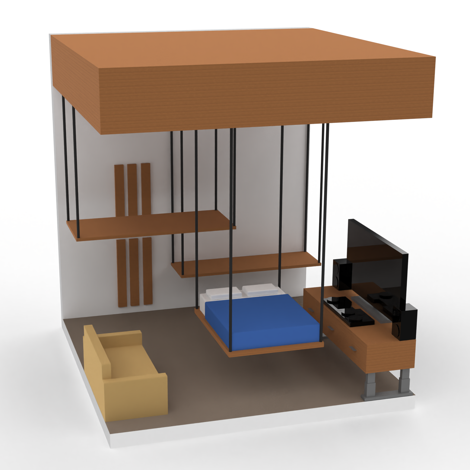 Incorporates innovative, space-saving solutions, such as a ceiling-mounted bed, dining table, and desk that can be lowered when needed and retracted when not. An adjustable entertainment credenza/DJ stand provides flexible functionality, while fold-down wall slats create additional seating.